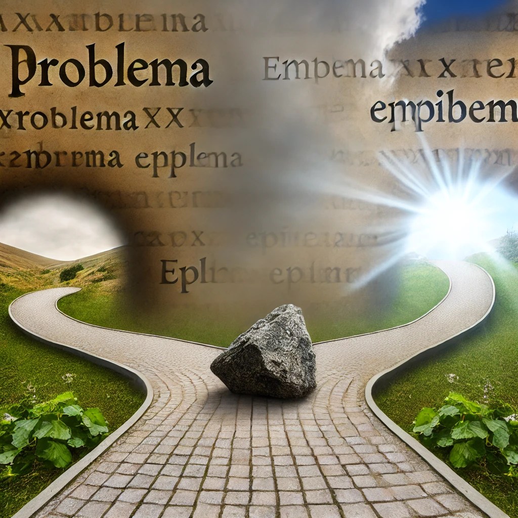 La palabra «problema» tiene su origen en tres palabras griegas: problema, emblema y epiblema, todas derivadas del verbo ballein, que significa lanzar, echar y poner. Originalmente, «problema» se refería a un objeto físico que se interponía en el camino de un viajero. Con el tiempo, se estableció una analogía entre el camino físico y el psicológico, transformando la palabra «problema» en una metáfora que describe algo que se interpone entre la realidad actual de una persona y lo que necesita o desea.