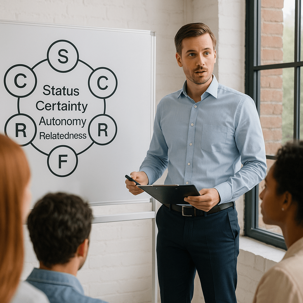 David Rock (2008), con su modelo SCARF, propone una guía poderosa y neurocientíficamente fundamentada para influir, colaborar y liderar de forma sostenible. Este modelo identifica cinco dominios sociales que el cerebro humano percibe como amenazas o recompensas: